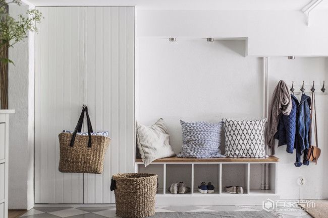入戶門/臥室門,門后墻上空間。不可否認(rèn),家里各個(gè)功能區(qū)墻面,是增加居家收納的重要途徑。然而,入戶門/臥室門的門后墻上空間往往被忽略了。畢竟,在部分人看來(lái),門后安裝門吸,就不適合再規(guī)劃收納了。其實(shí),這種認(rèn)知是有誤解的。即便是門后安裝了門吸,也是可以利用掛鉤+擱板規(guī)劃小型收納區(qū),用于收納包包、衣服、鑰匙等,絲毫不影響門吸的正常使用。對(duì)于因面積限制無(wú)法在定制鞋柜時(shí),打造小型衣帽間的玄關(guān)來(lái)說(shuō),利用好入戶門門后墻上空間,也不失為一種好的替代方法。值得一提的是,我們也可以直接在門上裝掛鉤。
