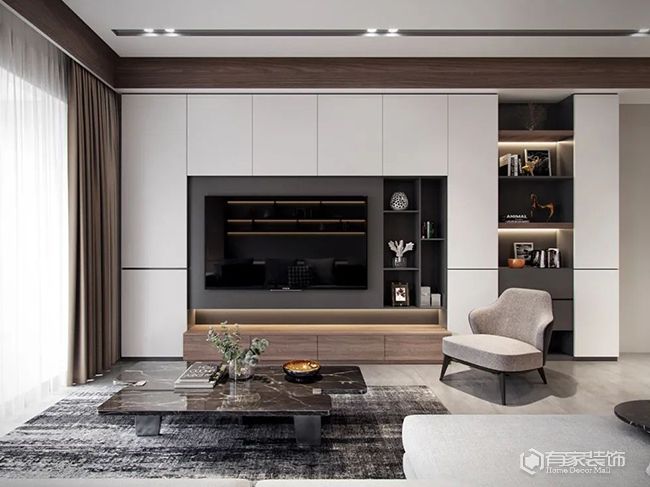 再者,嵌入式設(shè)計(jì)的定制電視柜,也讓客廳的空間感更好,宛如一幅靚麗的風(fēng)景線。當(dāng)然了,打造嵌入式電視柜設(shè)計(jì),也有一定的先決條件,比如所在墻體是非承重墻。關(guān)于定制電視柜,也是有一些重要細(xì)節(jié)要特別注意。其一,電視柜的深度。想要滿足客廳常用物品的正常收納,電視柜深度建議做到35到40厘米。其二,電視柜建議做到頂。這不僅是增加收納上的考慮,更是避免頂部裸露區(qū)域成為衛(wèi)生死角。其三,留空格展示架。畢竟,大面積帶柜門(mén)的收納柜,會(huì)讓空間顯壓抑。還有一點(diǎn),電視機(jī)位置,左右上下預(yù)留5到10cm縫隙,方便安裝與散熱。